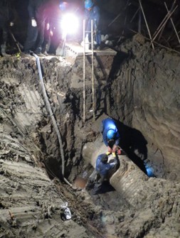 11月23日,濱海北側泵站DN500進水管多處斷裂,導致濱海興濱路華納藥業門口的綠化帶上出現了一條長50米,寬3米深1米的溝壑,情況十分危險。維修分公司立即組織人員趕赴現場勘察,面對路面濕滑結冰;高壓電線、水管光纜錯綜復雜;管道破損區域廣、埋藏深度深等困難,維修員們早出晚歸,每天工作12小時,歷時17天,修復管道一百三十余米,終于在12月8日,順利完成濱海興濱路DN500管搶修工作。